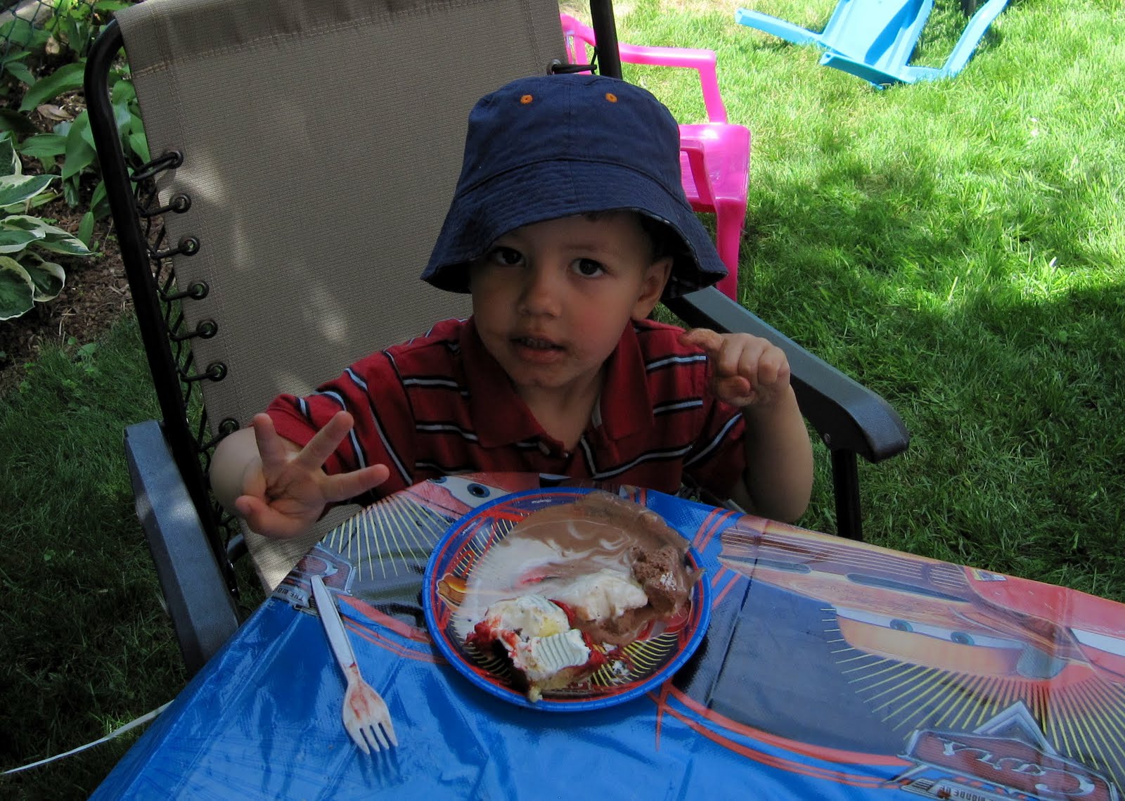 When did this happen? Honestly, I want to know. What has happened to the past three years? Who said he could grow up? Since when does he tell jokes, make up songs, wipe off my kisses, go upstairs to the bathroom by himself, make up stories to tell me, get his sister a toy...? Since when does he come up with a list of people to invite to his birthday party (me, his dad, and Opa topped the list... haha), since when does he decide he wants to be the goalie and 'play in the net', and decide that he has a favourite colour (brown)? Since when does he know how to climb the rock wall at the playground and go down the Big Kids' Slide? Who said he gets to grow up??